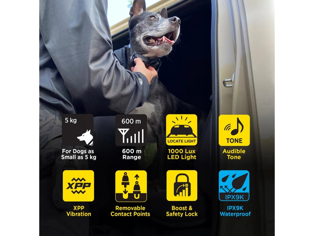 Vďaka funkciám zvukový signál, vibrácia a BOOST umožňuje rýchlejšie privolanie a lepšie sústredenie psa. Obojok je vybavený LED svetlom, ktoré uľahčuje lokalizáciu psa, a funkciou uzamknutia úrovne stimulácie pre vyššiu bezpečnosť.